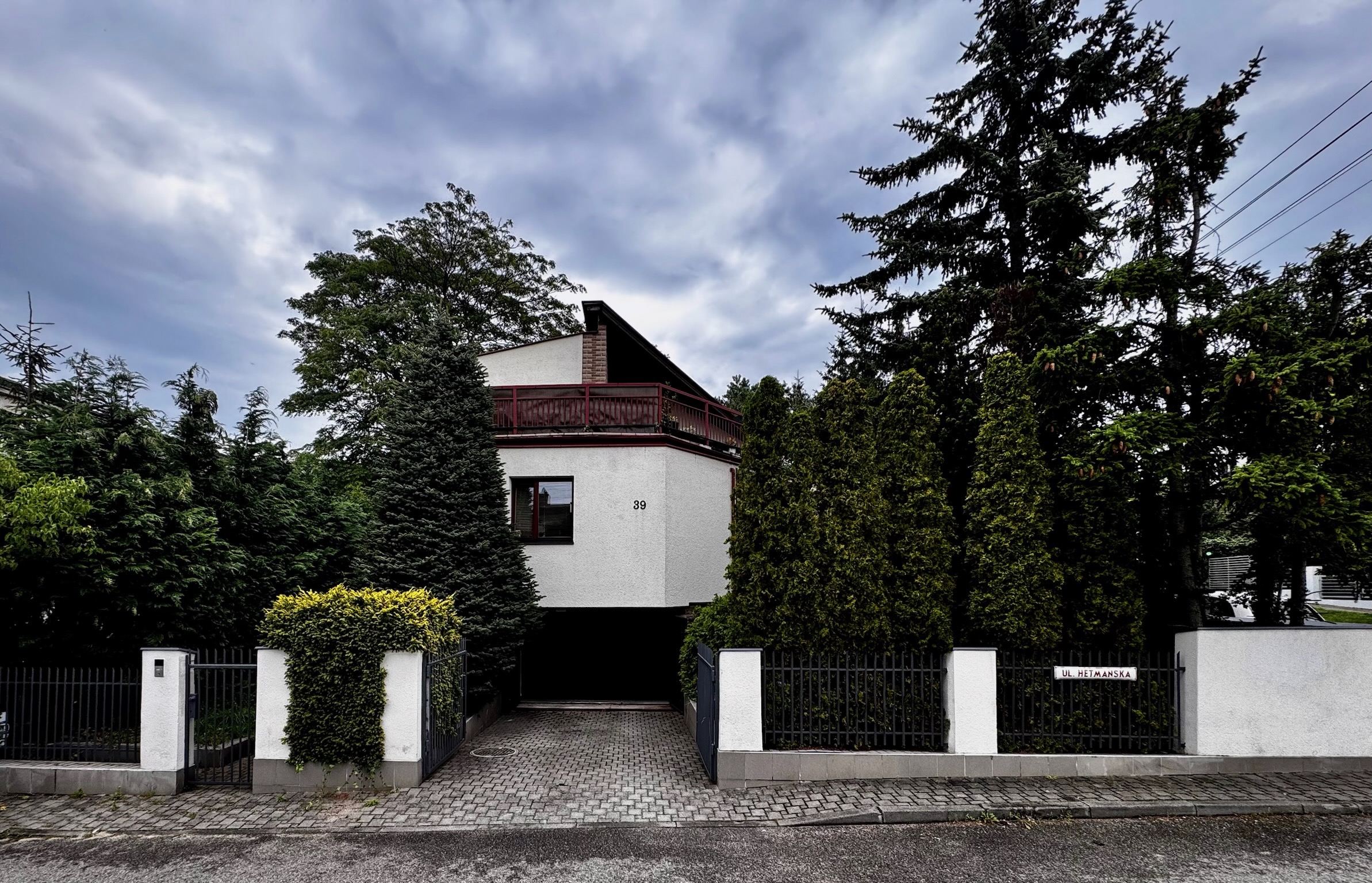 Solidna, modernistyczna bryła z przełomu lat 80. i 90., posadowiona na zadrzewionej działce 650 m². Liczne przeszklenia i ekspozycja na cztery strony świata zapewniają naturalne światło przez cały dzień. Wnętrza przeszły renowację i są gotowe do zamieszkania, elewacja w dobrym stanie.