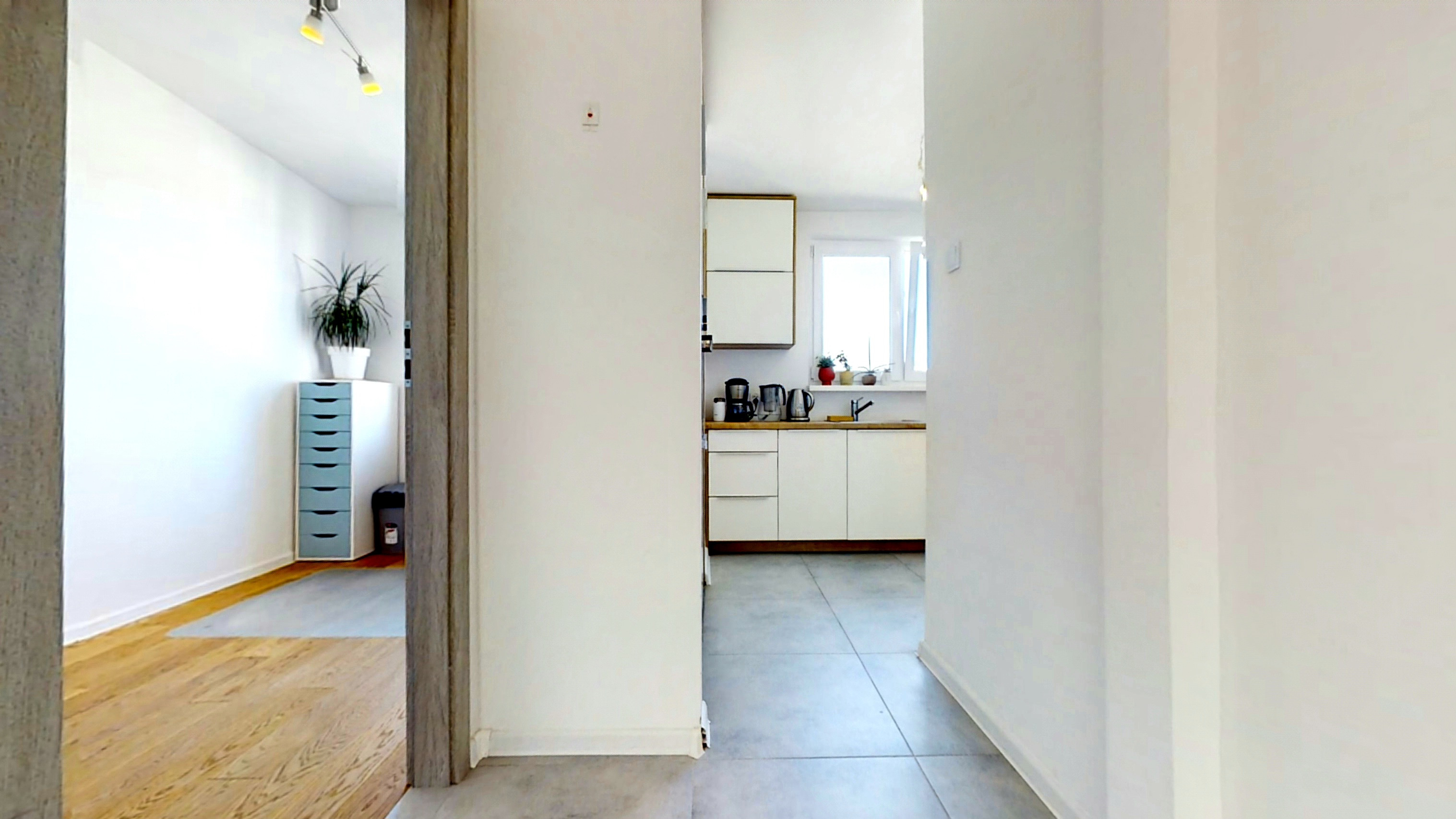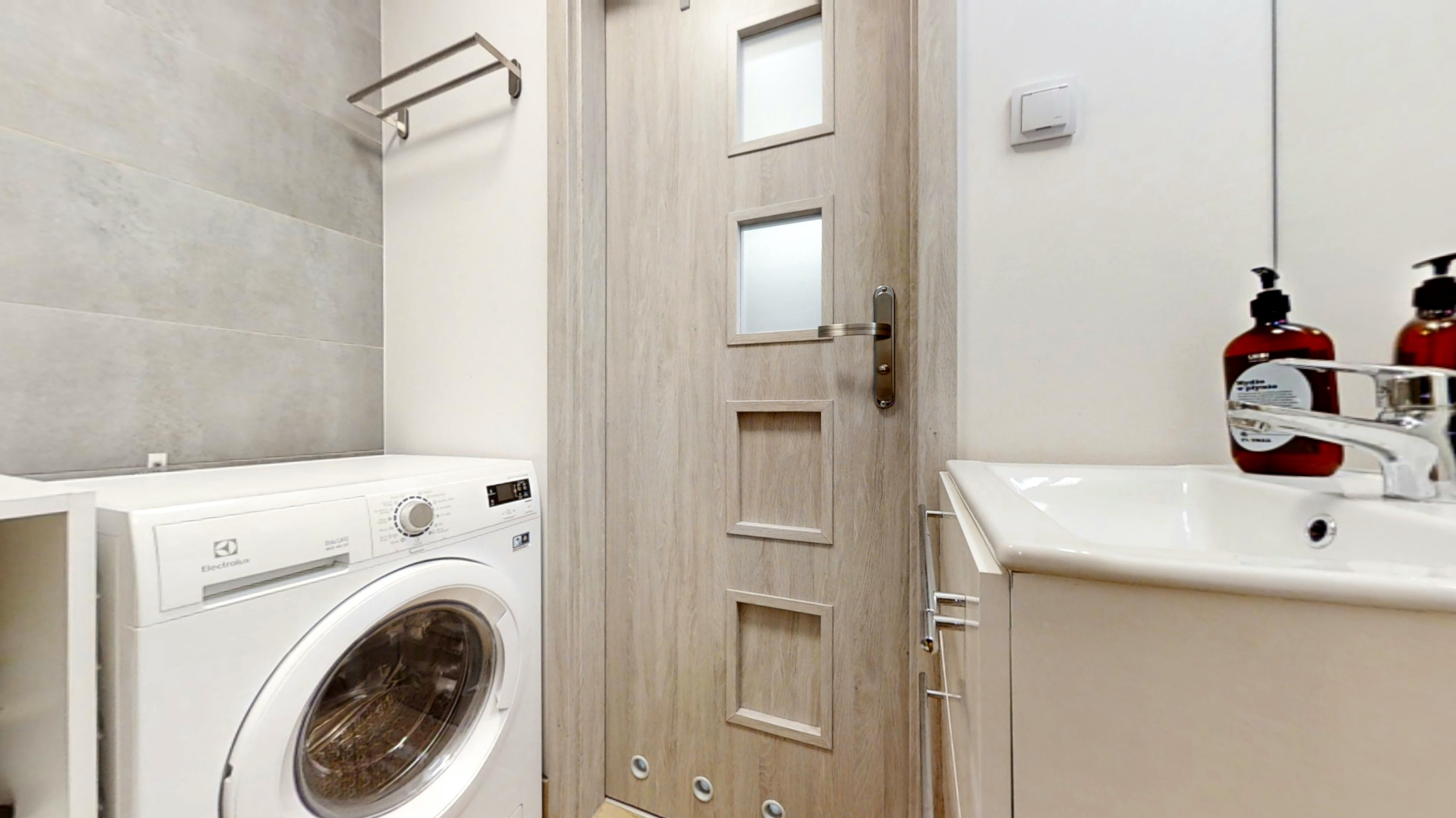 Zaraz po wejściu do mieszkania znajdujemy się w przestronnym holu z dużą szafą przesuwną. Po prawej stronie znajduje się wejście do nowoczesnej, funkcjonalnej łazienki z prysznicem i pralką.