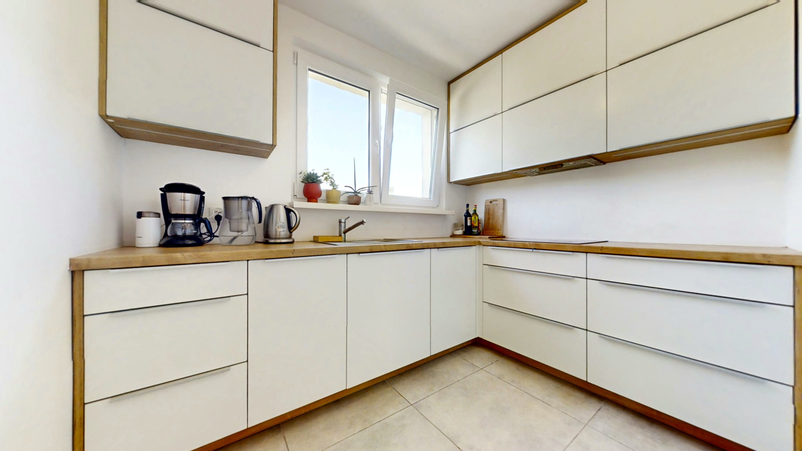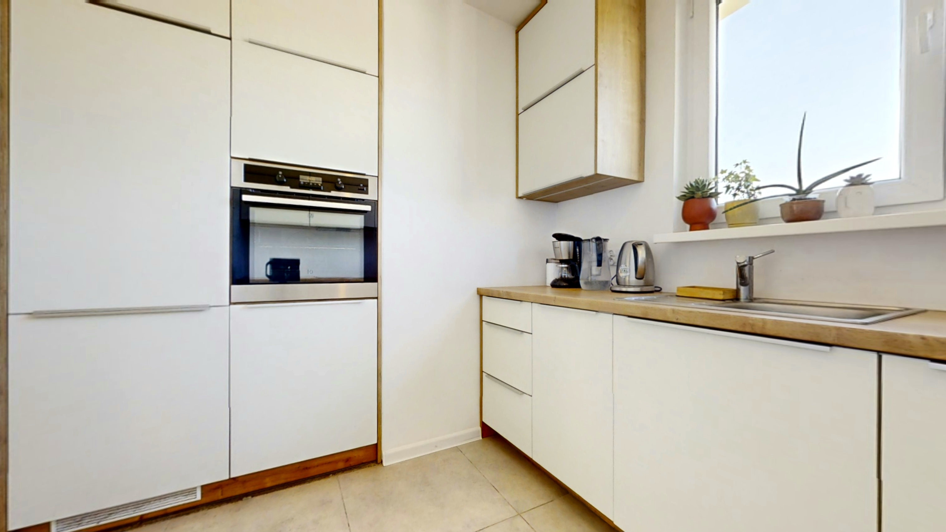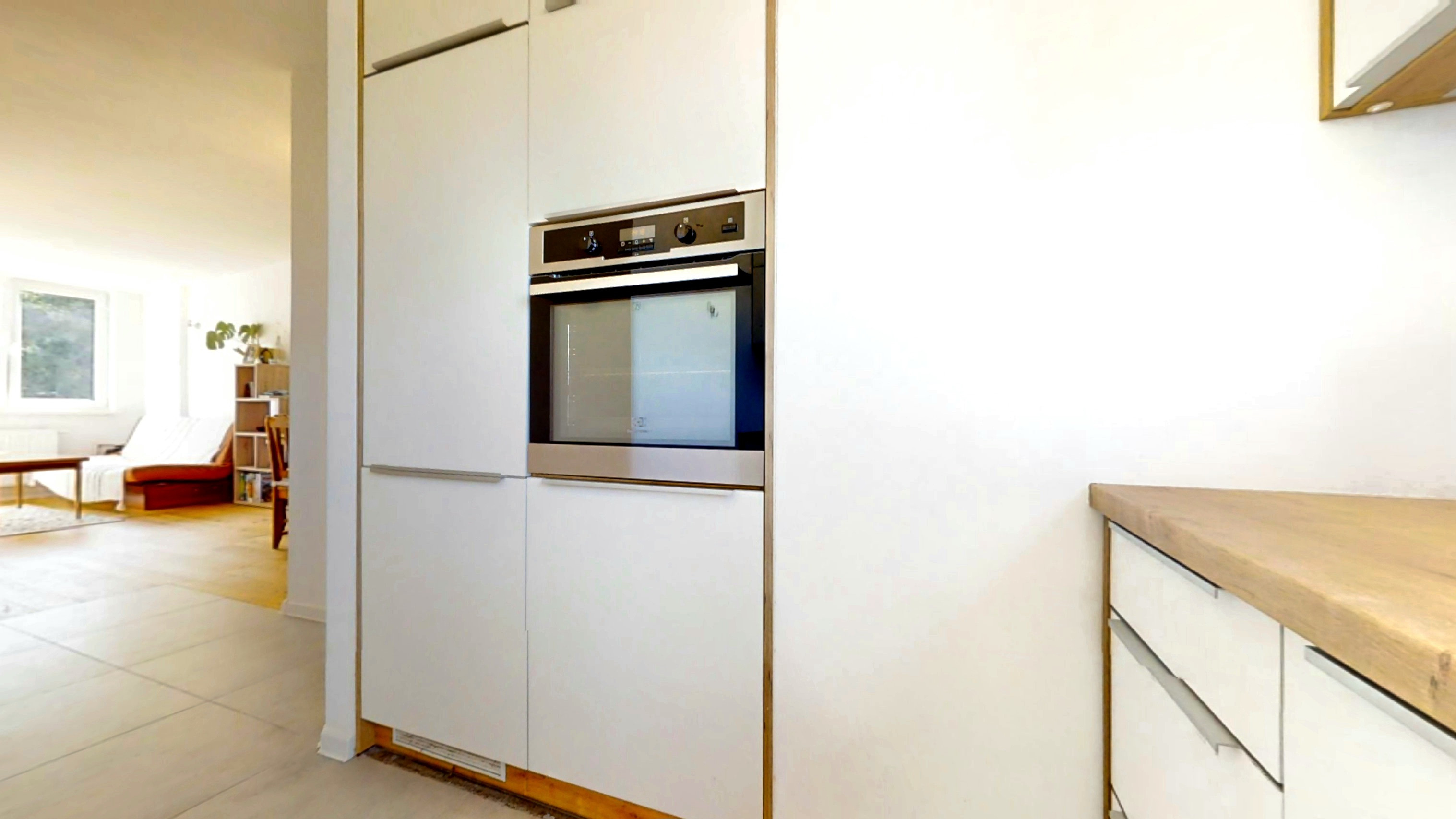 Naprzeciw salonu znajduje się kuchnia z piękną, nowoczesną i funkcjonalną zabudową z szafek oraz sprzętem AGD.