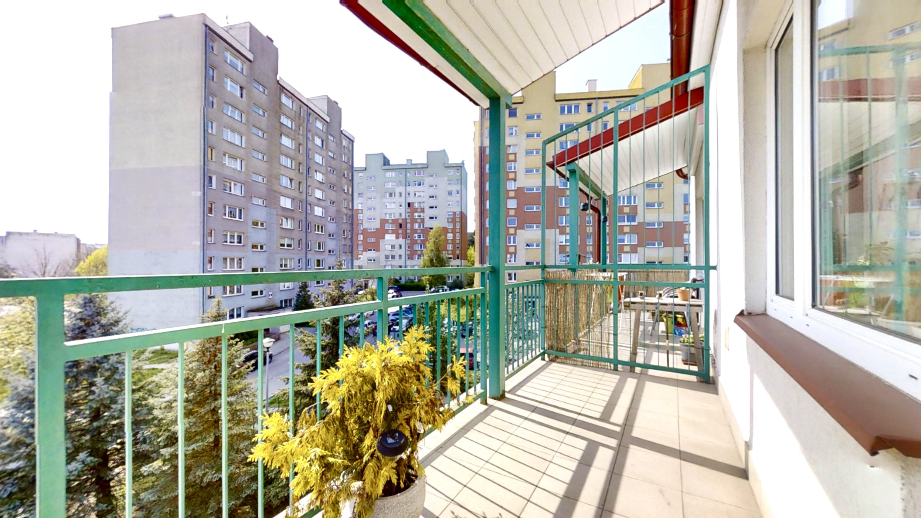Z okien widać zieleń, oraz pobliskie bloki.