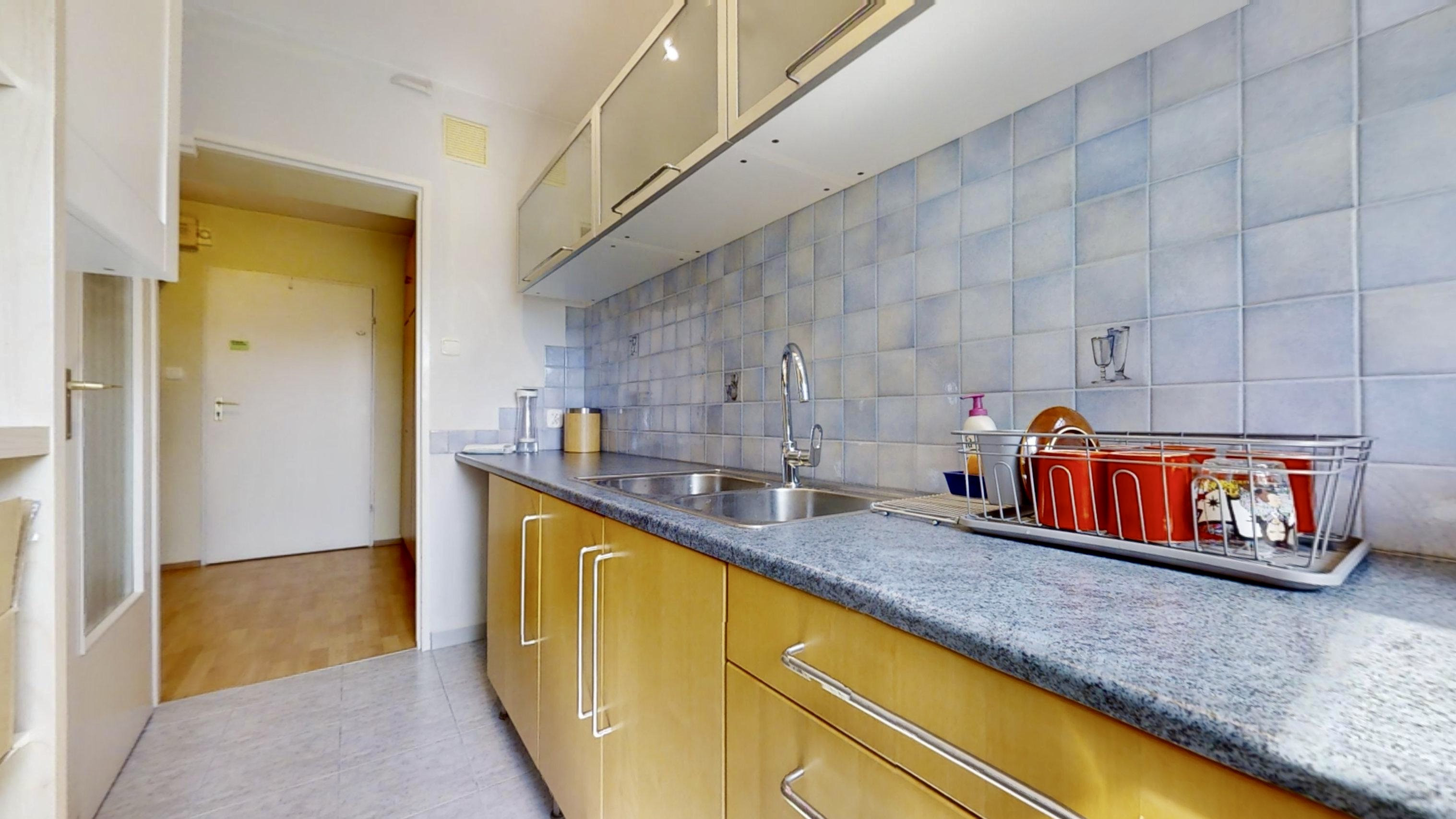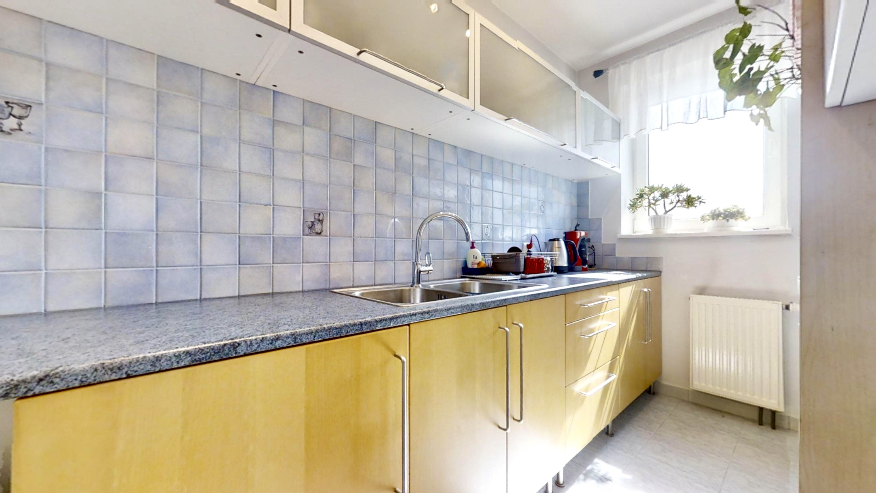 Składa się z funkcjonalnego, dużego pokoju oraz oddzielnej kuchni - obydwa pomieszczenia z południowo zachodnią wystawą okien, a także z korytarza, dużej łazienki z obszernym prysznicem, oraz posiada 8 metrowy balkon. Jest utrzymane w dobrym stanie.