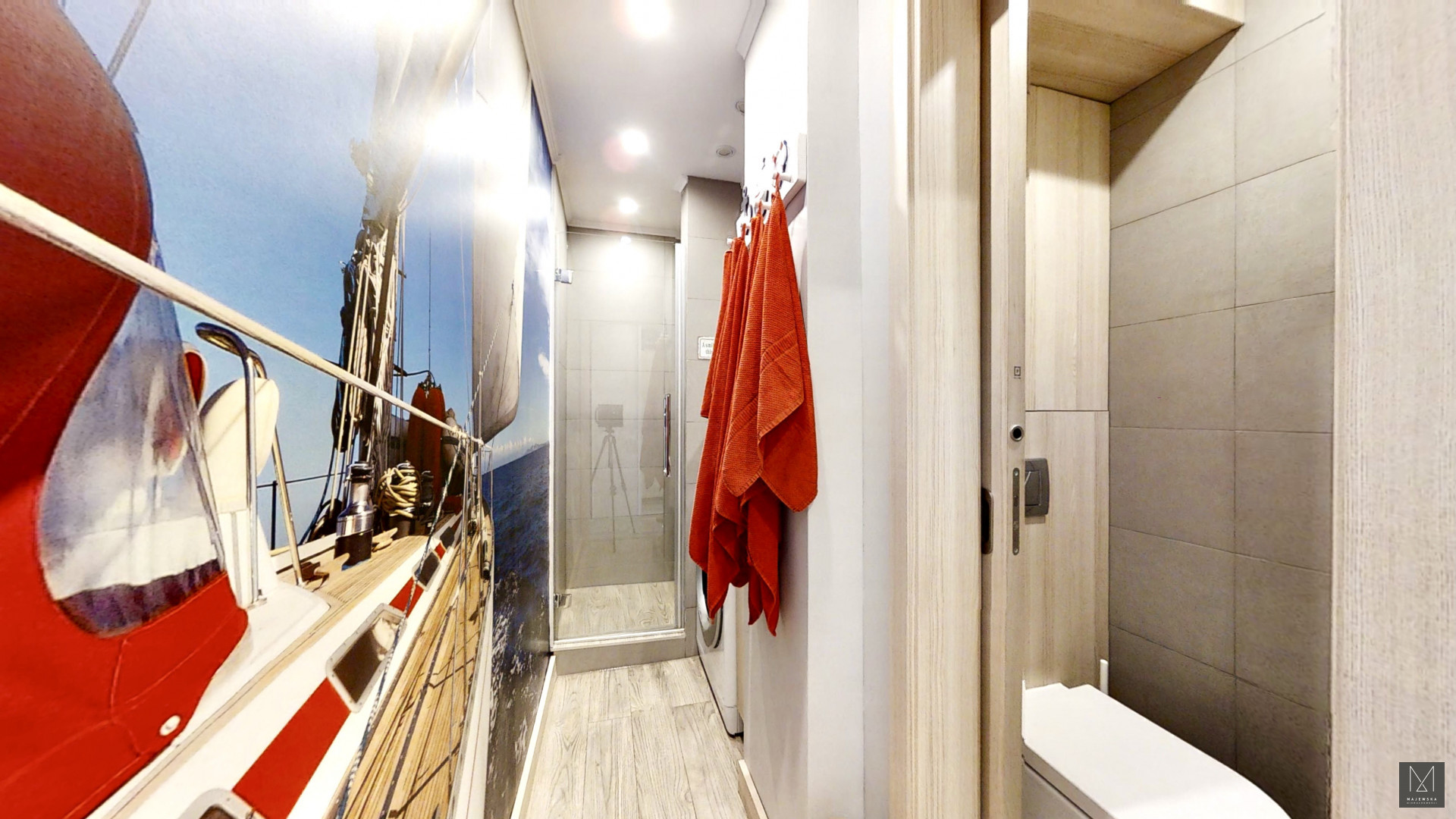 Zaraz po wejściu po prawej stronie korytarza jest nowoczesna, funkcjonalna łazienka z prysznicem.
