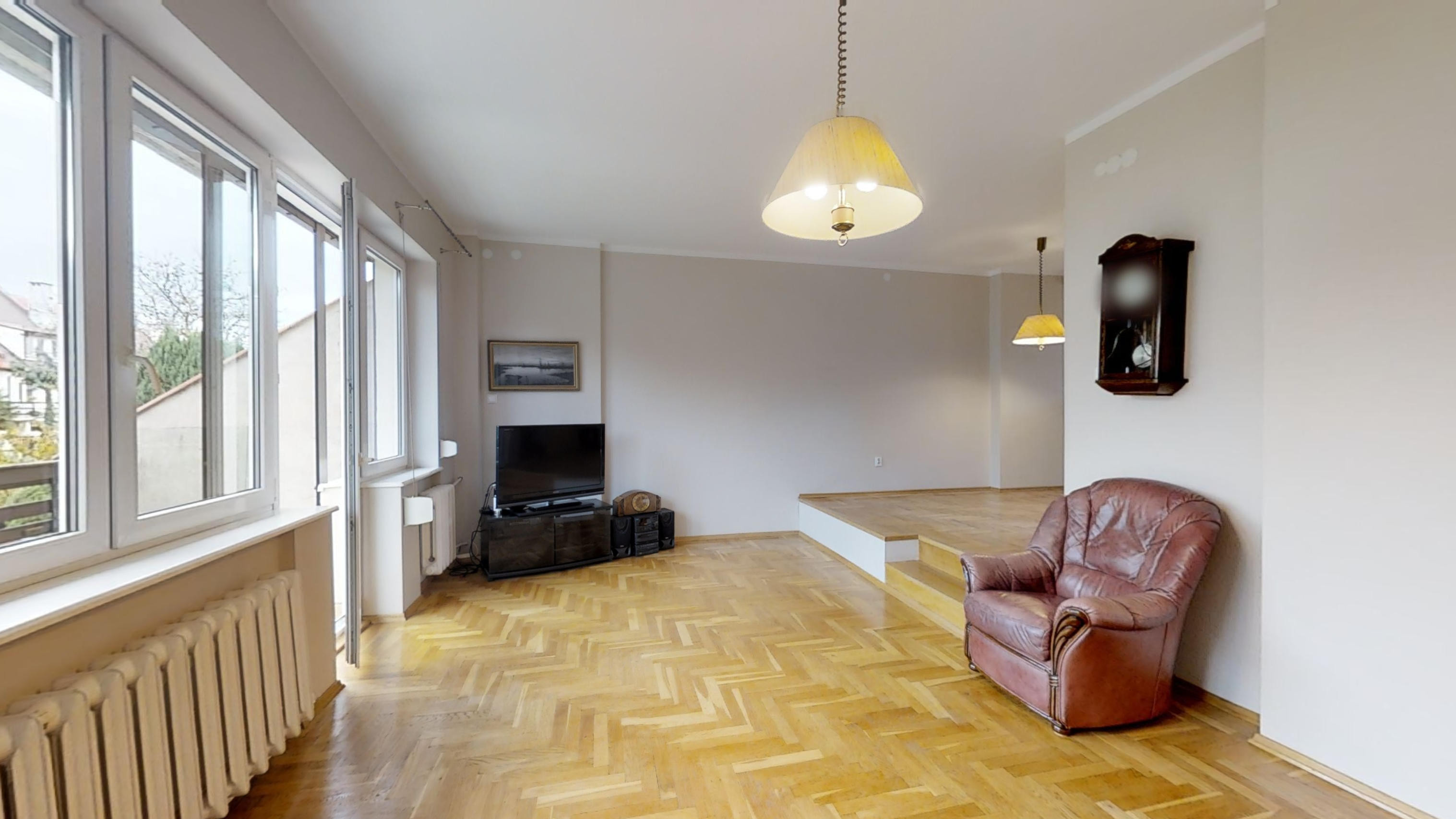 Na poziomie pierwszym znajduje się hol, łazienka, salon a także spora jadalnia oraz z kuchnia. Z salonu wyjście na taras i zejście w do ogrodu.