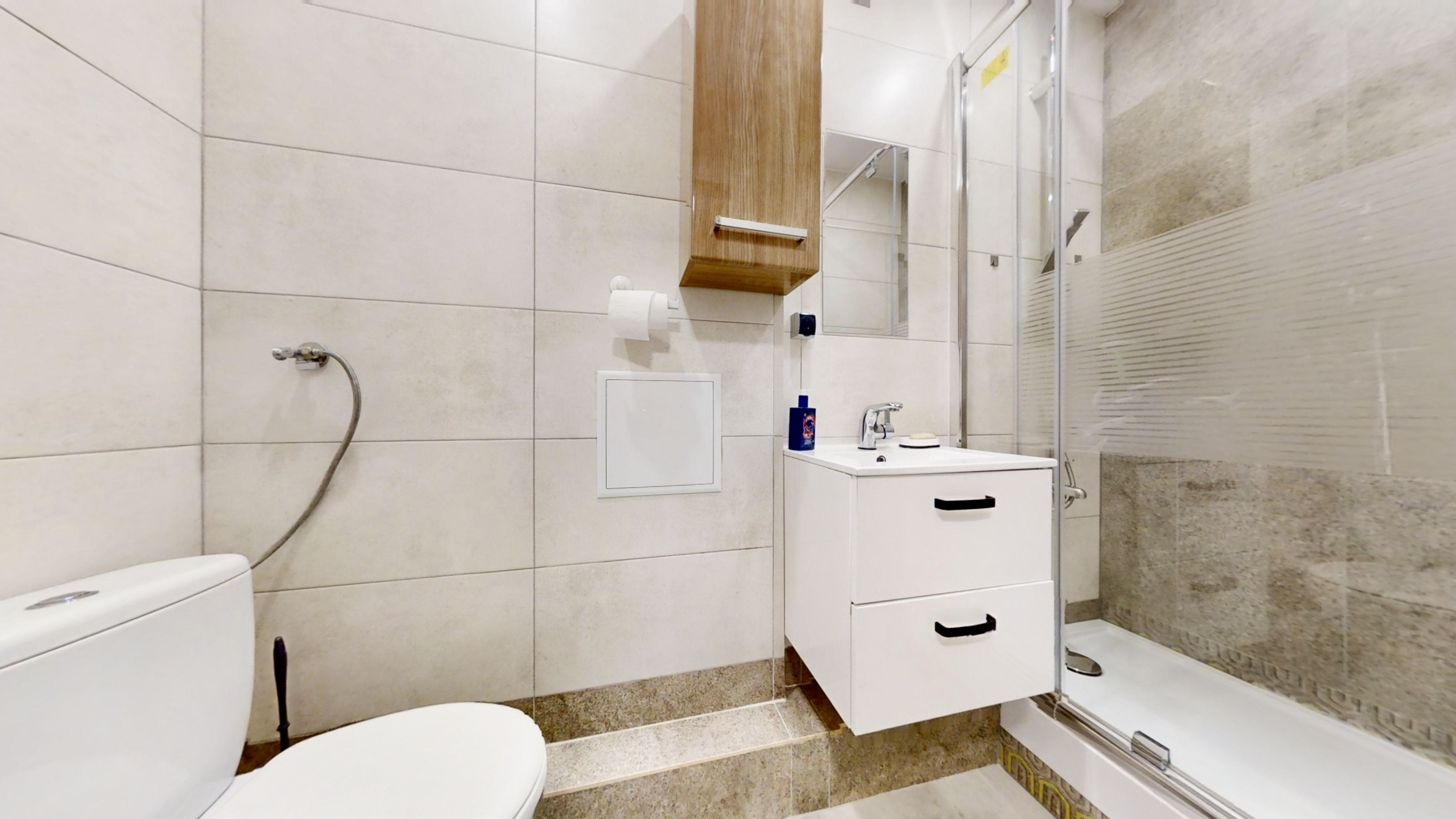 Łazienka: Nowoczesna łazienka o powierzchni 3,6 m² z prysznicem, WC i umywalką. Całość wykończona w jasnych, neutralnych kolorach.